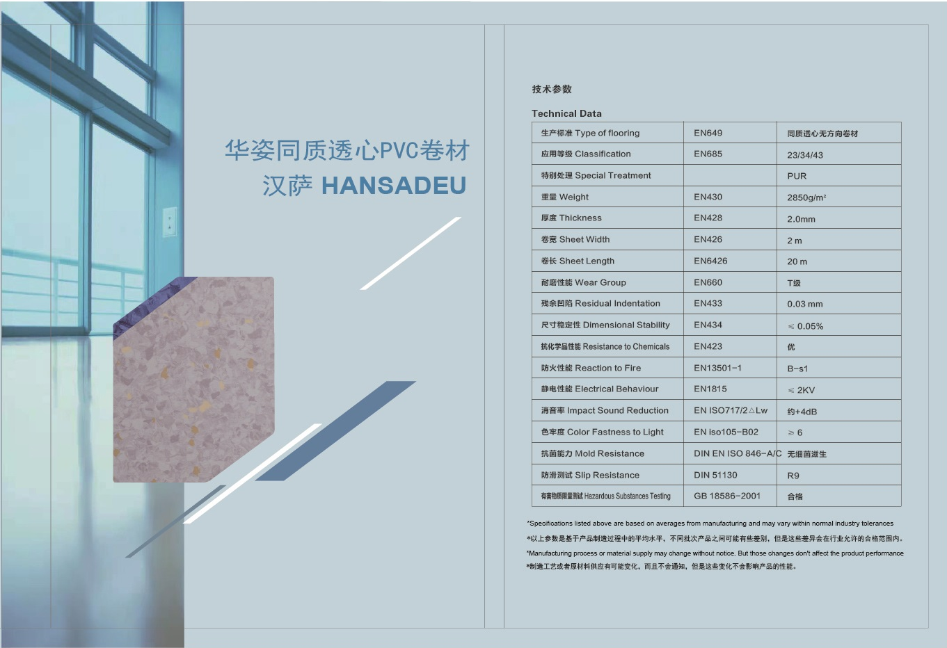 医疗工程建设中很重要的一个环节便是地面材料的选用,目前各大医院的病房、手术室等多选用医用抗菌地材。汉萨医用地材具有优秀的抗菌性能、优良的弹性、出色的外观和经久耐用的质量等多种优势,广泛应用于公共场所,商业区域,医院,学校,实验室,办公大楼等场所。目前公司医用地材产品有医用PVC弹性地材和医用橡胶地材两种,其中PVC弹性地材采用二次成型连续滚压生产流程,经过备料-搅拌-碾压-成型-再碾压-成型-背面打磨-表面PUR-冷热处理-裁切-包装,在流水线作业下一次性完成,可增强提高产品密度及抗压承载力。通过PUR加强处理,可以形成一层特殊的保护层,增强光泽均匀,强劲降低表面张力,优异的抗碘性能和耐油污性能使地材清洁更为便易,节约维护成本。汉萨橡胶地材采用来自东南亚的天然橡胶,填充料和装饰性颗粒大部分源于天然的矿物资源,不含PVC,增塑剂(邻苯二甲酸酯),卤素和有机氯化物。因此汉萨橡胶地材具有持久的高弹性,符合人体工程学,行走舒适的特性,致密封闭的表面使地材具有耐磨损、使用寿命长和耐污的特点。